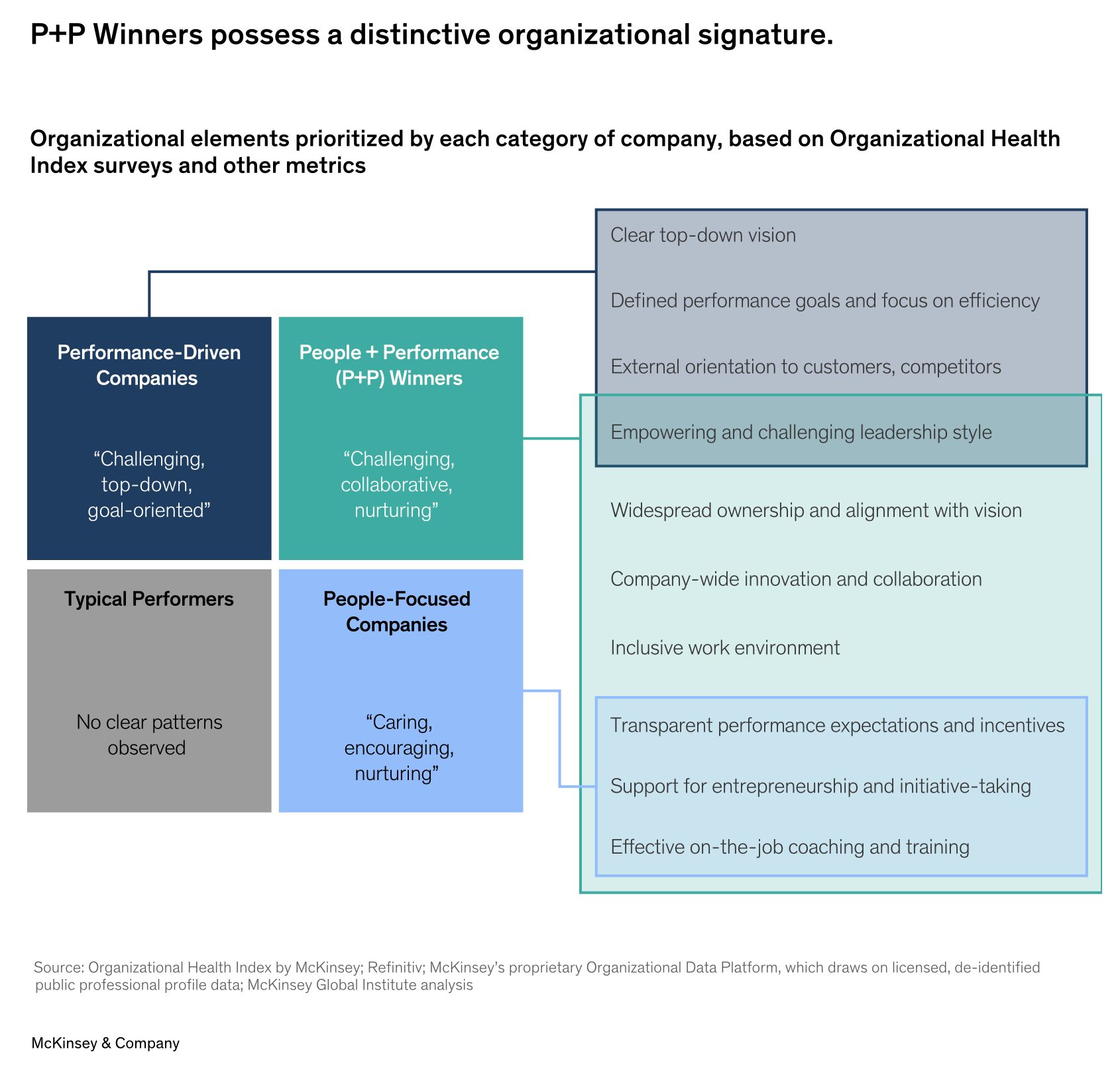 Organizational capital is the fabric that surrounds employees, and its pattern matters. We compare the practices of each group of companies using McKinsey’s Organizational Health Index diagnostic and other firm-level metrics. P+P Winners have a distinctive signature characterized by consultative and challenging leadership styles; bottom-up innovation and collaboration; positive and inclusive work environments; and rewards and advancement opportunities for employees (Exhibit 2). Performance-Driven Companies have similar leadership styles but are more externally oriented to customers and competitors, with less emphasis on engaging their people through company-wide innovation, motivation, work environment, and on-the-job coaching. People-Focused Companies have many practices in common with P+P Winners (such as motivating employees and creating positive work environments), but they are less results-oriented, and they do not emphasize bottom-up innovation.
