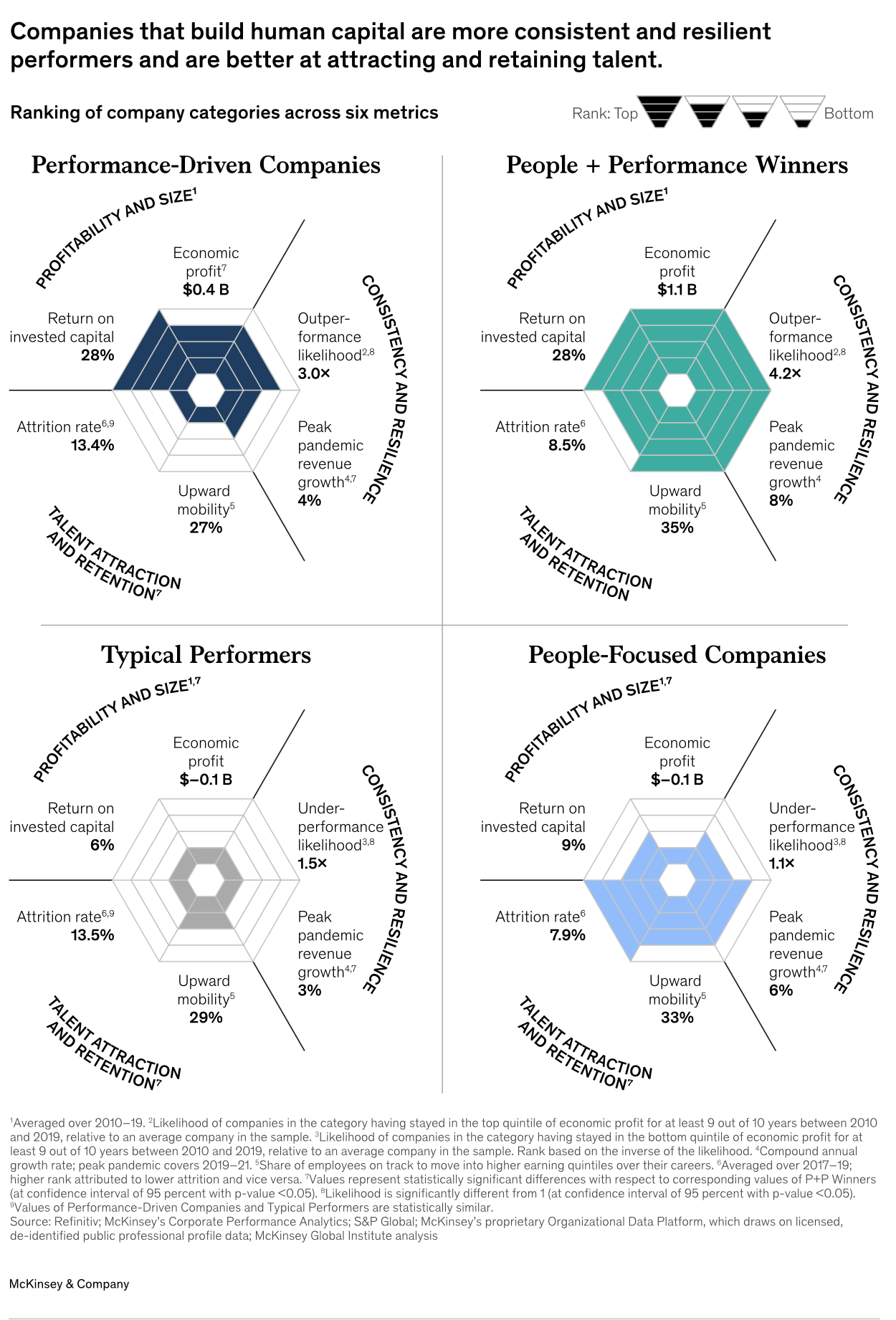 McKinsey analyzed 1,800 large companies across sectors in 15 countries, sorting them based on two factors: how much they focus on developing human capital and whether they financially outperform their sector peers.